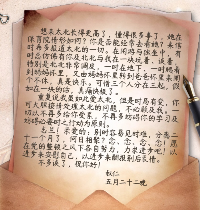 在信的最后,左權(quán)不得不忍痛交代妻子:“我雖如此愛太北,但是時局有變,你可大膽按情處理太北的問題,不必顧及我?!辈⒚銊钇拮右赃M(jìn)步來安慰自己,以進(jìn)步來酬報別后衷情。