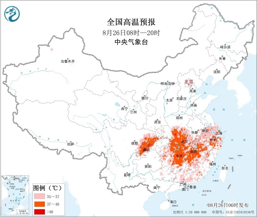 預(yù)計(jì)8月26日白天,四川東部、重慶、河南南部、湖北大部、湖南、江西、安徽中南部、江蘇南部、浙江、上海、福建大部、廣東北部、廣西北部以及新疆吐魯番盆地等地有35~39℃高溫天氣,其中,重慶中西部、湖北西南部、湖南東北部、江西北部、浙江中西部等地局地最高氣溫可超過40℃。中央氣象臺8月26日06時(shí)繼續(xù)發(fā)布高溫黃色預(yù)警。