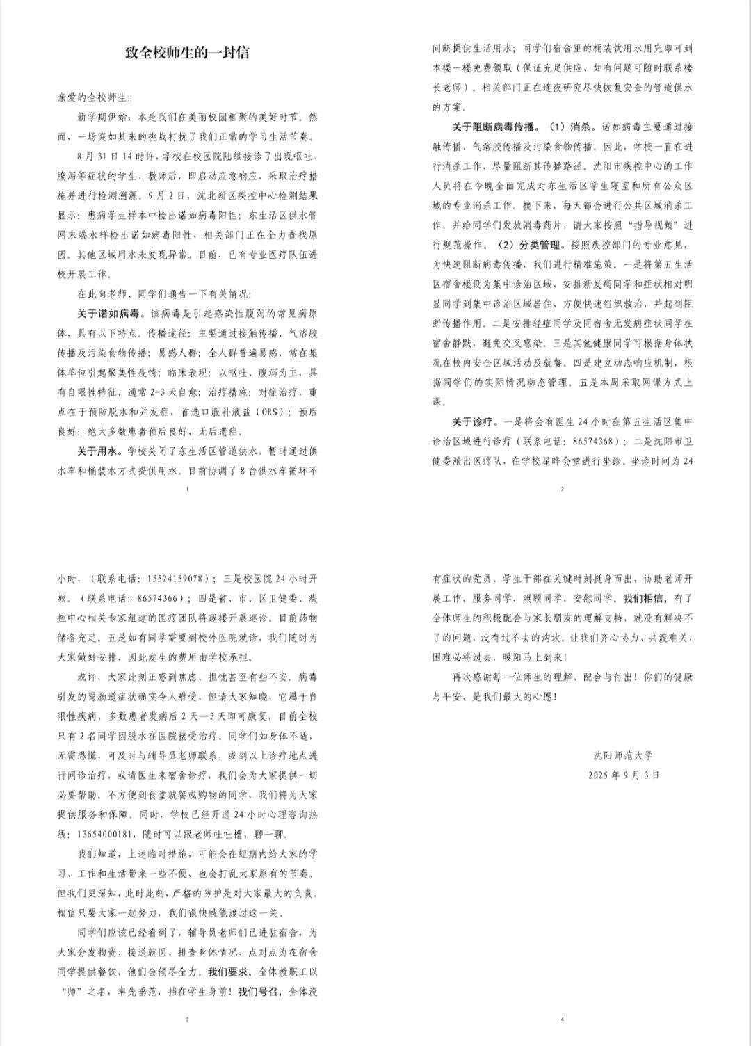 9月3日,沈陽(yáng)師范大學(xué)發(fā)布的《致全校師生的一封信》(以下簡(jiǎn)稱“《一封信》”)中稱,8月31日14時(shí)許,學(xué)校在校醫(yī)院陸續(xù)接診了出現(xiàn)嘔吐、腹瀉等癥狀的學(xué)生、教師。相關(guān)部門正在全力查找原因,目前已有專業(yè)醫(yī)療隊(duì)伍進(jìn)校開(kāi)展工作。