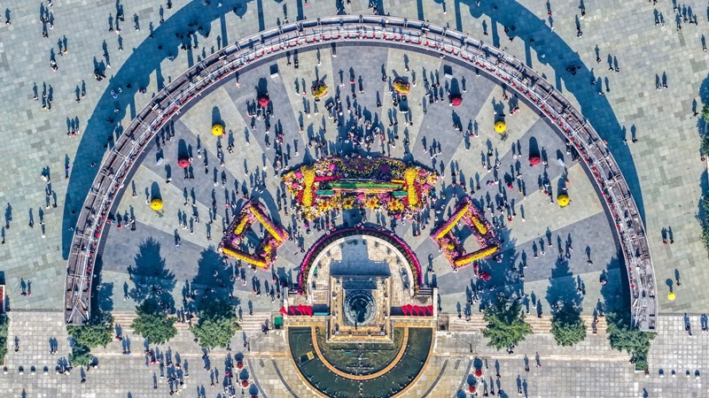 10月2日,游客在黑龍江省哈爾濱市防洪勝利紀(jì)念塔廣場游玩(無人機(jī)照片)。