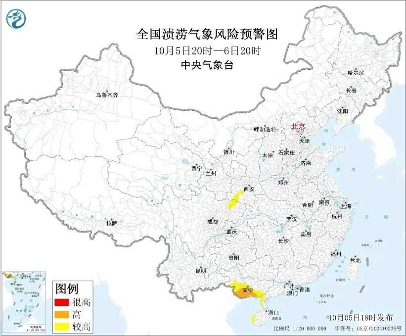 中央氣象臺10月5日18時發(fā)布漬澇風(fēng)險氣象預(yù)報:受強降雨的影響,預(yù)計10月5日20時至6日20時,廣東西南部、廣西南部和西部、海南西部、四川東北部、陜西西部等地部分地區(qū)發(fā)生漬澇的氣象風(fēng)險較高,其中,廣西南部等地部分地區(qū)發(fā)生漬澇的氣象風(fēng)險高,易形成城市內(nèi)澇和農(nóng)田漬害,需加強防范。