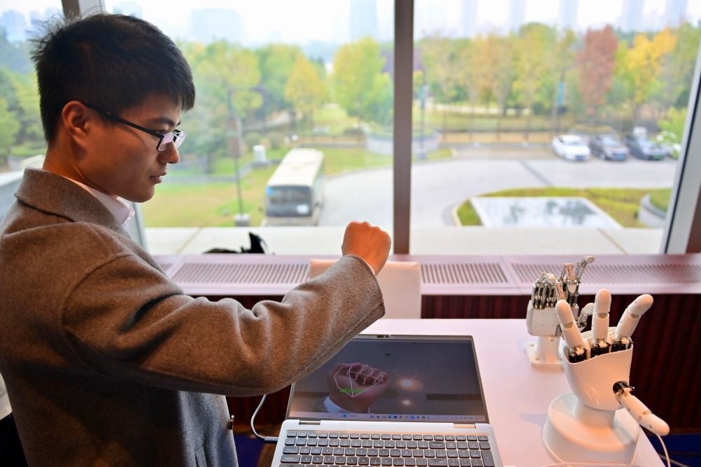 10月17日,在中國科學(xué)院沈陽自動(dòng)化研究所展臺(tái),工作人員演示“仿生五指靈巧手”展品。新華社記者 吳青昊 攝