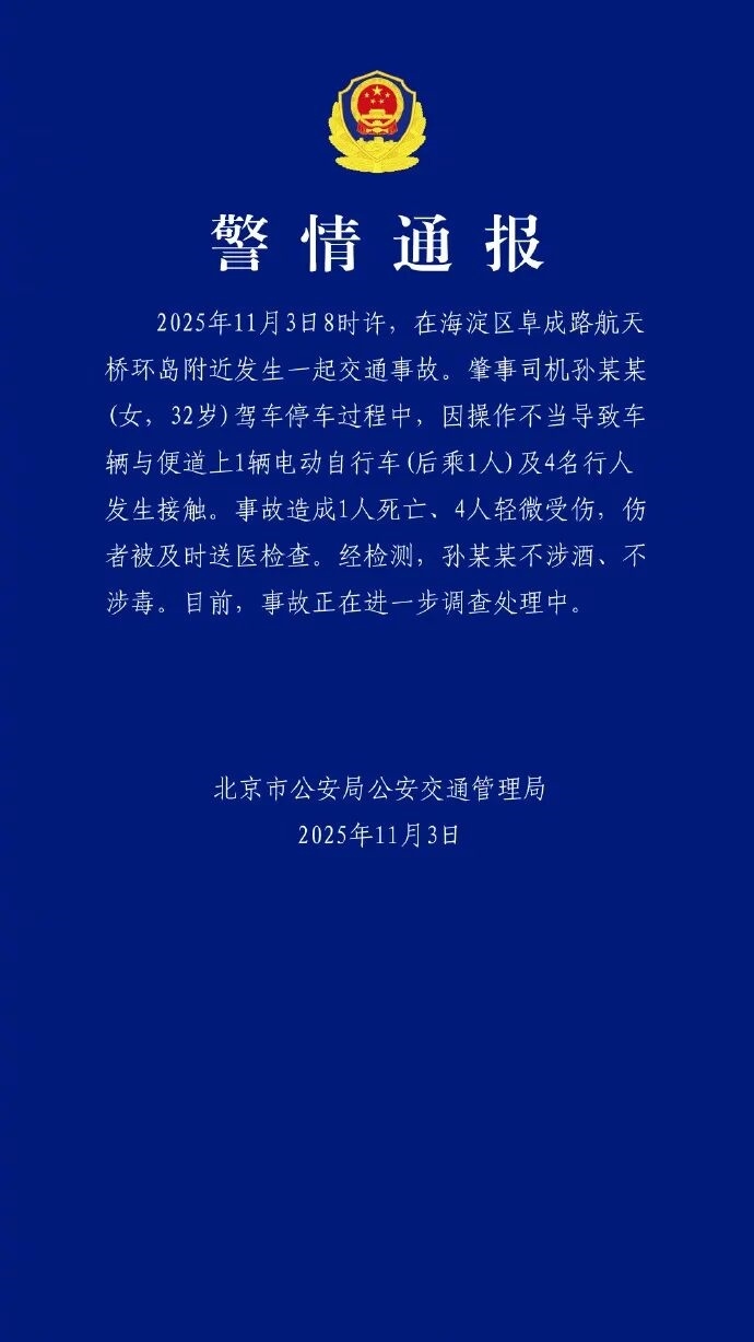 中國網(wǎng)11月3日訊 11月3日,北京交警發(fā)布通報(bào),當(dāng)日8時(shí)許,在海淀區(qū)阜成路航天橋環(huán)島附近發(fā)生一起交通事故。肇事司機(jī)孫某某(女,32歲)駕車停車過程中,因操作不當(dāng)導(dǎo)致車輛與便道上1輛電動(dòng)自行車(后乘1人)及4名行人發(fā)生接觸。事故造成1人死亡、4人輕微受傷,傷者被及時(shí)送醫(yī)檢查。經(jīng)檢測,孫某某不涉酒、不涉毒。目前,事故正在進(jìn)一步調(diào)查處理中。
