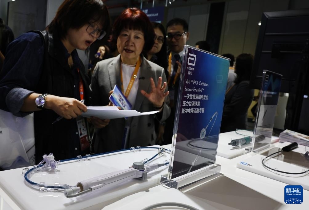 11月6日,參觀者在雅培公司一款磁電定位壓力監(jiān)測(cè)球囊脈沖電場(chǎng)消融導(dǎo)管展品前駐足觀看,這是該產(chǎn)品的亞洲首展。