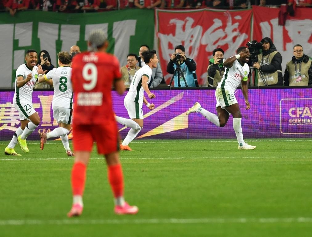 12月6日,北京國安隊球員法比奧(右一)在比賽中慶祝進(jìn)球。新華社記者 李嘉南 攝