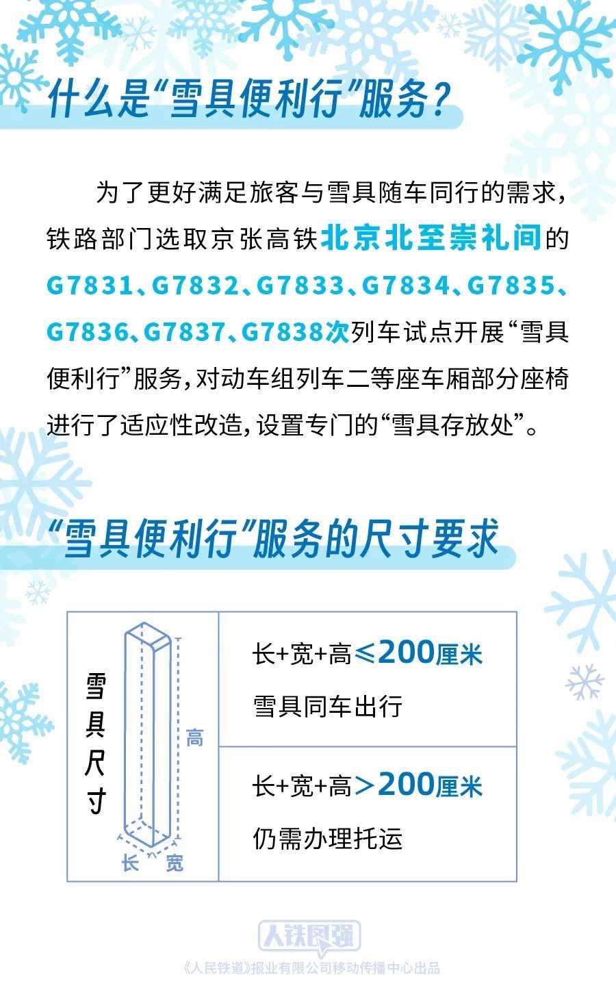 鐵路部門堅持以人民為中心的發(fā)展思想,持續(xù)深化運(yùn)輸供給側(cè)結(jié)構(gòu)性改革,積極適應(yīng)旅客多樣化的出行需求,為攜帶雪具出行的旅客提供便捷服務(wù)。前期,鐵路部門按照《國鐵集團(tuán)鐵路旅客運(yùn)輸規(guī)程》“旅客乘坐動車組列車隨身攜帶的行李物品長、寬、高之和不超過130厘米”的規(guī)定,對超過上述尺寸標(biāo)準(zhǔn)的雪具推出了“雪具快運(yùn)”服務(wù)。為了更好滿足旅客與雪具隨車同行的需求,鐵路部門統(tǒng)籌考慮旅客安全、乘車秩序和雪具運(yùn)輸需求,選取京張高鐵北京北至崇禮間的G7831、G7832、G7833、G7834、G7835、G7836、G7837、G7838次列車試點(diǎn)開展“雪具便利行”服務(wù),對動車組列車二等座車廂部分座椅進(jìn)行了適應(yīng)性改造,設(shè)置專門的“雪具存放處”,旅客選擇該服務(wù)后可攜帶長、寬、高之和不超過200厘米的雪具同車出行,滑雪更加方便快捷。對于長、寬、高之和超過200厘米的雪具,由于高鐵列車車內(nèi)空間限制,仍需辦理托運(yùn)。