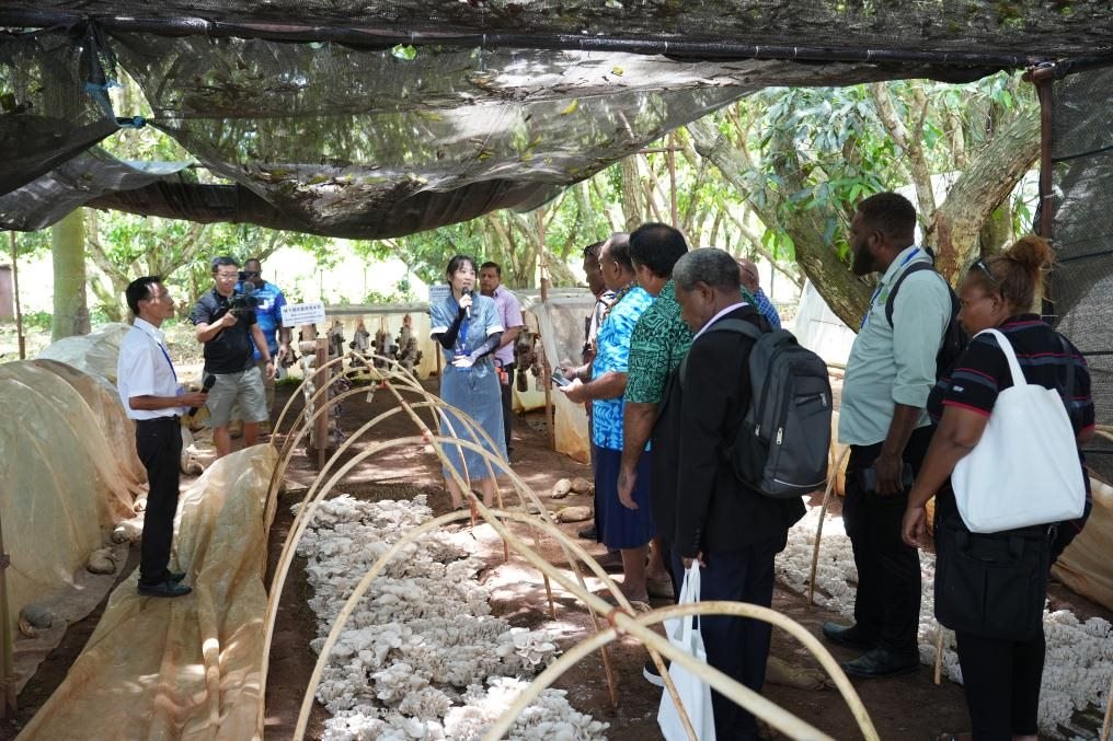 11月19日,在斐濟(jì)楠迪中國(guó)—太平洋島國(guó)菌草技術(shù)示范中心,與會(huì)代表參觀(guān)菌草菇種植示范基地。新華社發(fā)(高鑫攝)