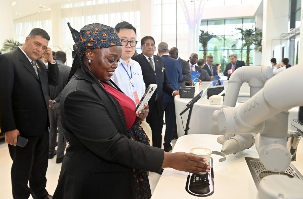 10月29日,駐華使節(jié)代表團(tuán)在中國(guó)-東盟國(guó)家人工智能應(yīng)用合作中心參觀(guān)體驗(yàn)機(jī)器人制作咖啡。新華社記者 陸波岸 攝