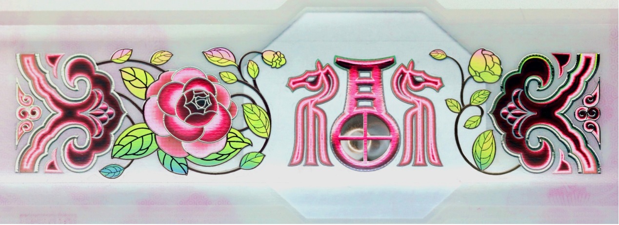位于票面下方。改變觀察角度,票面正面可見“如意云紋”、“山茶花”與“?!弊纸M成的裝飾紋樣呈現(xiàn)多色動(dòng)感特征?!案!弊窒虏俊疤铩弊謨?nèi)可見立體動(dòng)感高亮圓環(huán)效果。防偽特征效果見圖6。