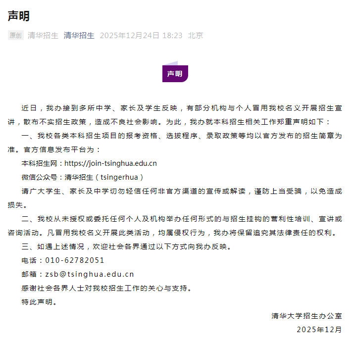 據(jù)“清華招生”微信公眾號消息,清華大學(xué)招生辦公室24日發(fā)布聲明稱,近日,清華大學(xué)招生辦公室接到多所中學(xué)、家長及學(xué)生反映,有部分機構(gòu)與個人冒用清華大學(xué)名義開展招生宣講,散布不實招生政策,造成不良社會影響。為此,清華大學(xué)招生辦公室就本科招生相關(guān)工作鄭重聲明如下: