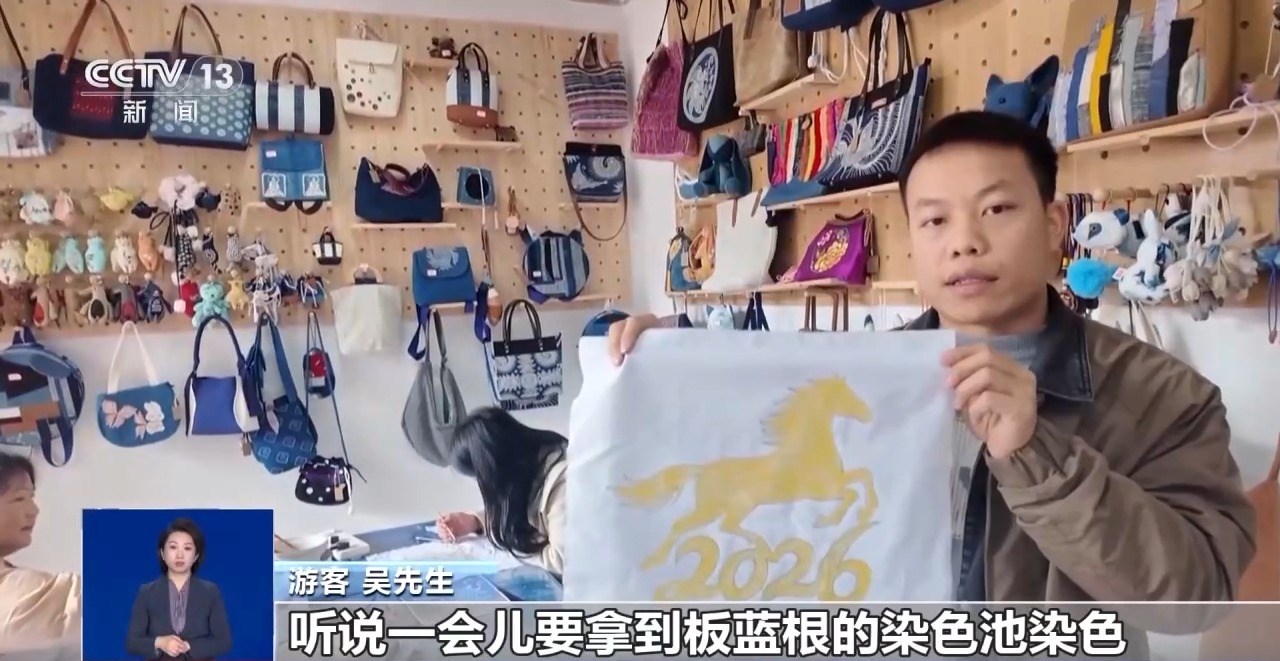 游客 吳先生:我畫(huà)的是一幅奔馬,聽(tīng)說(shuō)一會(huì)兒要拿到板藍(lán)根的染色池染色,脫蠟以后做成方巾。明年是2026年,祝大家馬到成功。