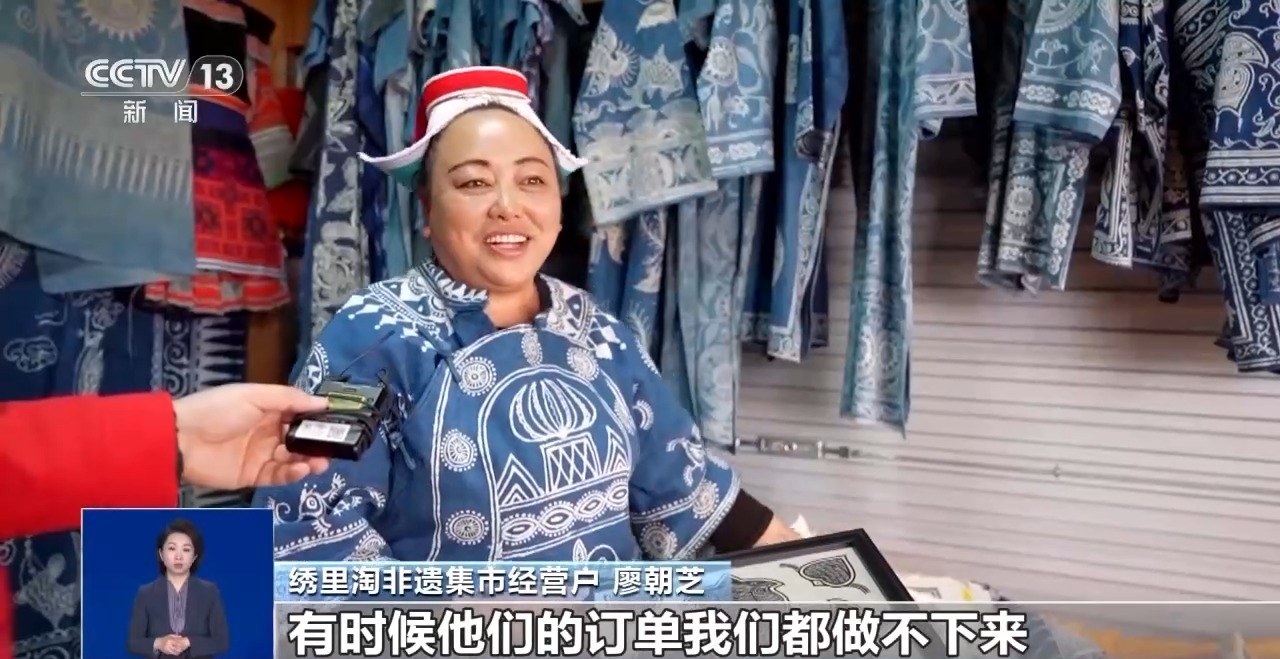 繡里淘非遺集市經(jīng)營(yíng)戶 廖朝芝:我們家主要是賣蠟染。顧客很喜歡,有時(shí)候給我們介紹訂單,有時(shí)候他們的訂單我們都做不下來(lái)。