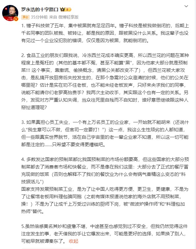 1月16日,@羅永浩的十字路口 再次發(fā)長文回應西貝賈國龍近日的言論。他表示,錘子科技做了五年,集中被黑就有足足四年。錘子科技是被我做倒閉的,后期上千名同事的團隊被裁、被轉讓,都是我的原因,跟被黑沒什么關系。我這輩子也沒有見過一個企業(yè)沒犯別的錯誤,僅僅是因為被黑,就能倒閉的。