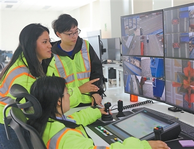 2025年10月7日,在秘魯錢凱港,中遠(yuǎn)海運港口秘魯錢凱公司中外員工進行作業(yè)監(jiān)控。