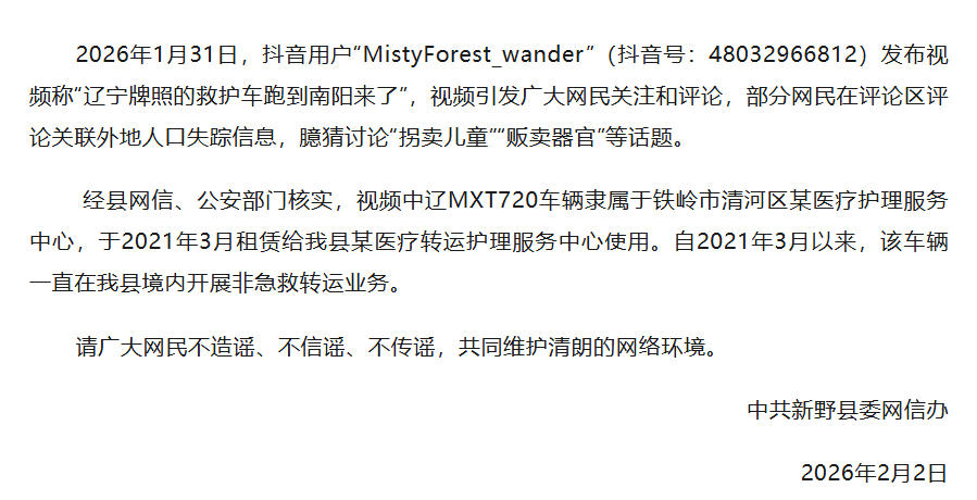 中國網(wǎng)2月2日訊 據(jù)“新野發(fā)布”微信公眾號(hào)消息,2月2日上午,河南省南陽市新野縣委網(wǎng)信辦發(fā)布情況說明稱,2026年1月31日,抖音用戶“MistyForest_wander”(抖音號(hào):48032966812)發(fā)布視頻稱“遼寧牌照的救護(hù)車跑到南陽來了”,視頻引發(fā)廣大網(wǎng)民關(guān)注和評(píng)論,部分網(wǎng)民在評(píng)論區(qū)評(píng)論關(guān)聯(lián)外地人口失蹤信息,臆猜討論“拐賣兒童”“販賣器官”等話題。