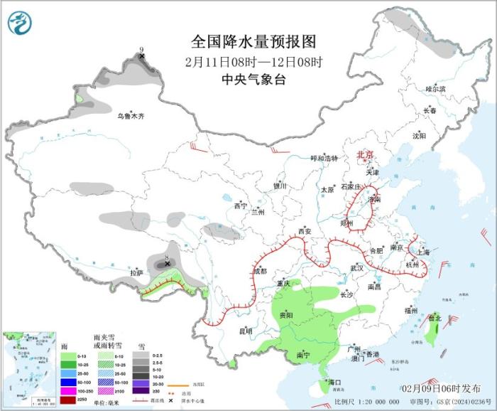 圖2 全國(guó)降水量預(yù)報(bào)圖(2月9日08時(shí)-10日08時(shí))圖片來(lái)源:中央氣象臺(tái)網(wǎng)站