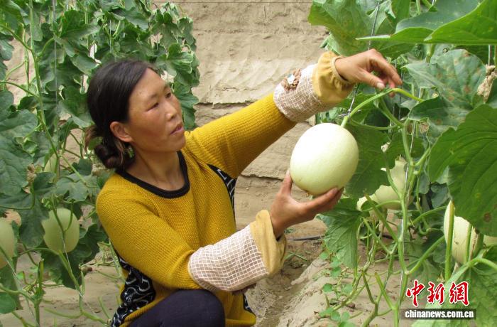 2月初,甘肅省武威市民勤縣種植戶(hù)查看玉菇甜瓜長(zhǎng)勢(shì)。馬愛(ài)彬 攝