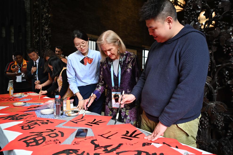 2月6日,亞太經(jīng)濟(jì)合作組織(APEC)2026年第一次高官會(huì)及相關(guān)會(huì)議的部分與會(huì)代表在廣州陳家祠體驗(yàn)中國(guó)書(shū)法。 新華社記者 鄧華 攝