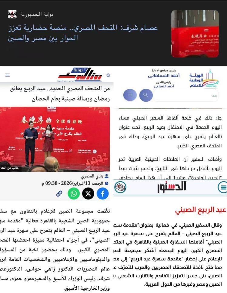 沙拉夫表示,本次活動(dòng)選擇在大埃及博物館舉辦,具有十分重要的意義,這是埃中兩大古老文明相知相交、交融共生的生動(dòng)見(jiàn)證。春節(jié)既承載著萬(wàn)象更新的美好希冀,也開(kāi)啟了辛勤耕耘的嶄新周期,蘊(yùn)含著人與自然和諧共生、尊重時(shí)序節(jié)律的中國(guó)哲學(xué)。2026年是馬年,在中國(guó)文化中,馬寓意著力量、進(jìn)取、活力,更象征著自信奔赴未來(lái)的精神。這種精神內(nèi)涵與當(dāng)前埃中關(guān)系蓬勃發(fā)展的良好態(tài)勢(shì)高度契合。愿兩國(guó)攜手并進(jìn),邁向更加光明的未來(lái)。