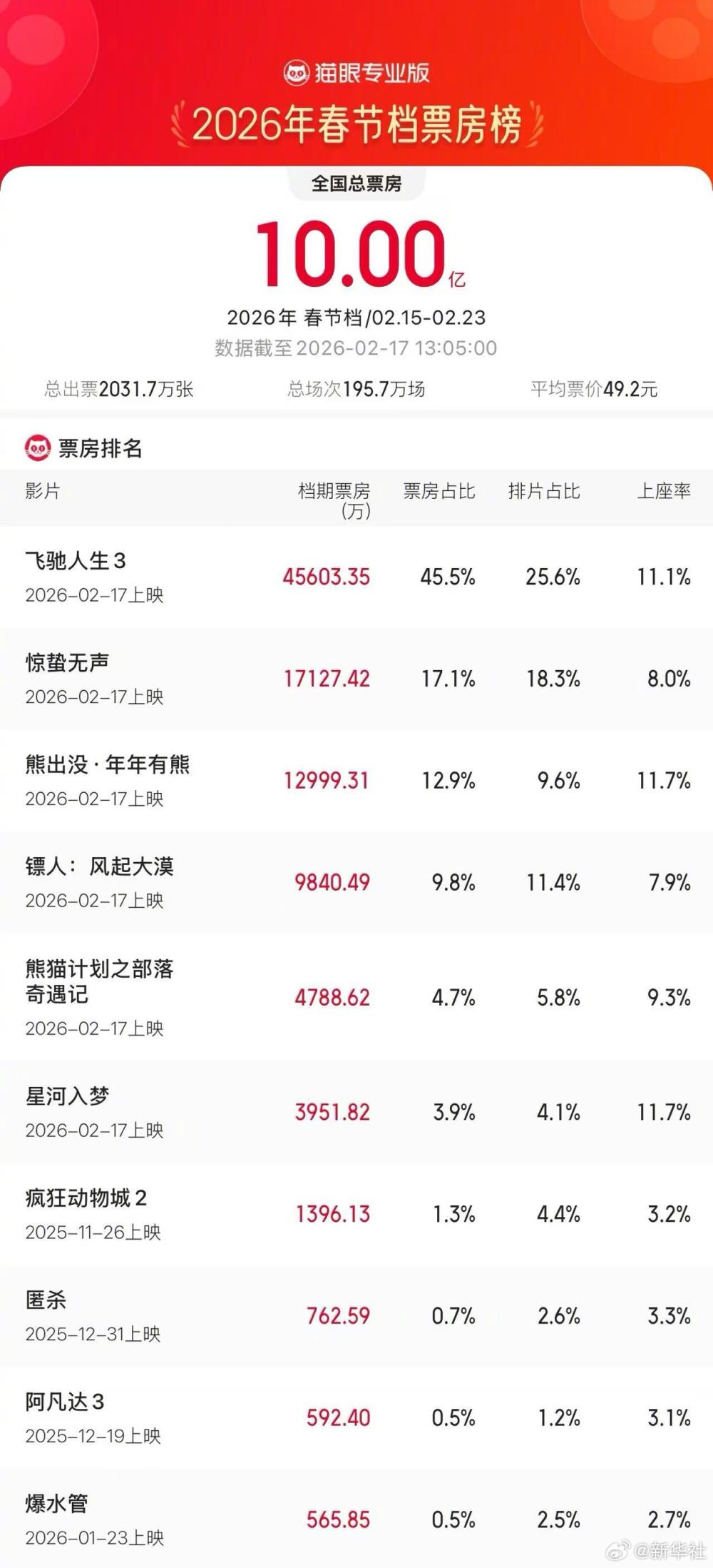 【2026年春節(jié)檔票房破10億】據(jù)網(wǎng)絡(luò)平臺(tái)數(shù)據(jù),2026年春節(jié)檔檔期總票房破10億,《飛馳人生3》,《驚蟄無(wú)聲》、《熊出沒》和《鏢人:風(fēng)起大漠》分列2026年春節(jié)檔票房榜前四。 一起聊聊,你最期待哪部春節(jié)檔電影?