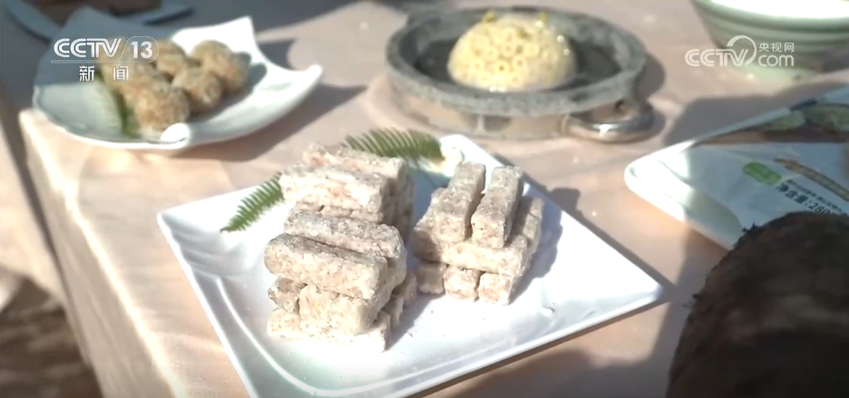 除了好看,當然也有好吃的。當地的紅糖年糕寓意著“年年高、步步高”。還有一道是用本地檳榔芋做成的掛霜芋,將芋塊加入白糖翻炒,表面裹上一層細細的糖霜,粉粉糯糯,是每家每戶逢年過節(jié)的必備菜肴。