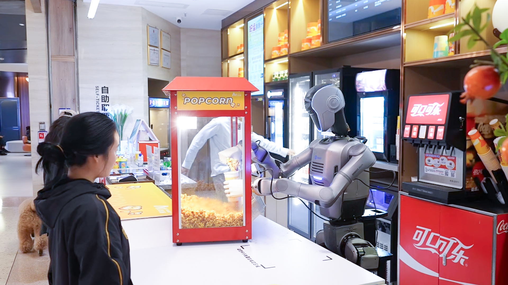 “滴——識別成功,開始制作?!鄙钲贙11影院的爆米花柜臺前,人形機器人抓起一只空紙杯,對準(zhǔn)出料口,金黃的爆米花簌簌落入杯中,不多不少恰好至刻度線。封口、遞送,動作雖機械但流暢。