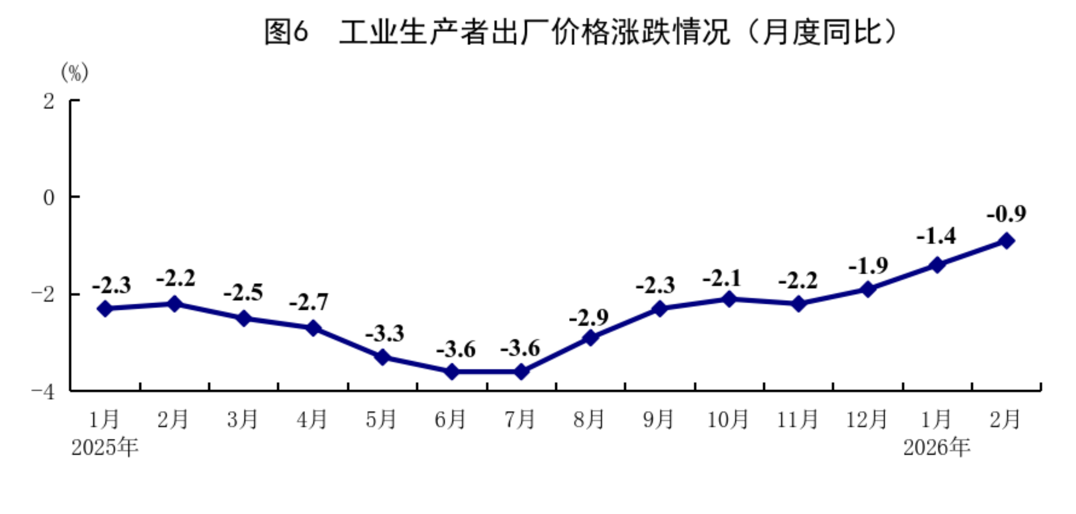 1—2月份,全國(guó)工業(yè)生產(chǎn)者出廠(chǎng)價(jià)格同比下降1.2%。分月看,1月份同比下降1.4%,環(huán)比上漲0.4%;2月份同比下降0.9%,環(huán)比上漲0.4%。1—2月份,全國(guó)工業(yè)生產(chǎn)者購(gòu)進(jìn)價(jià)格同比下降1.1%。