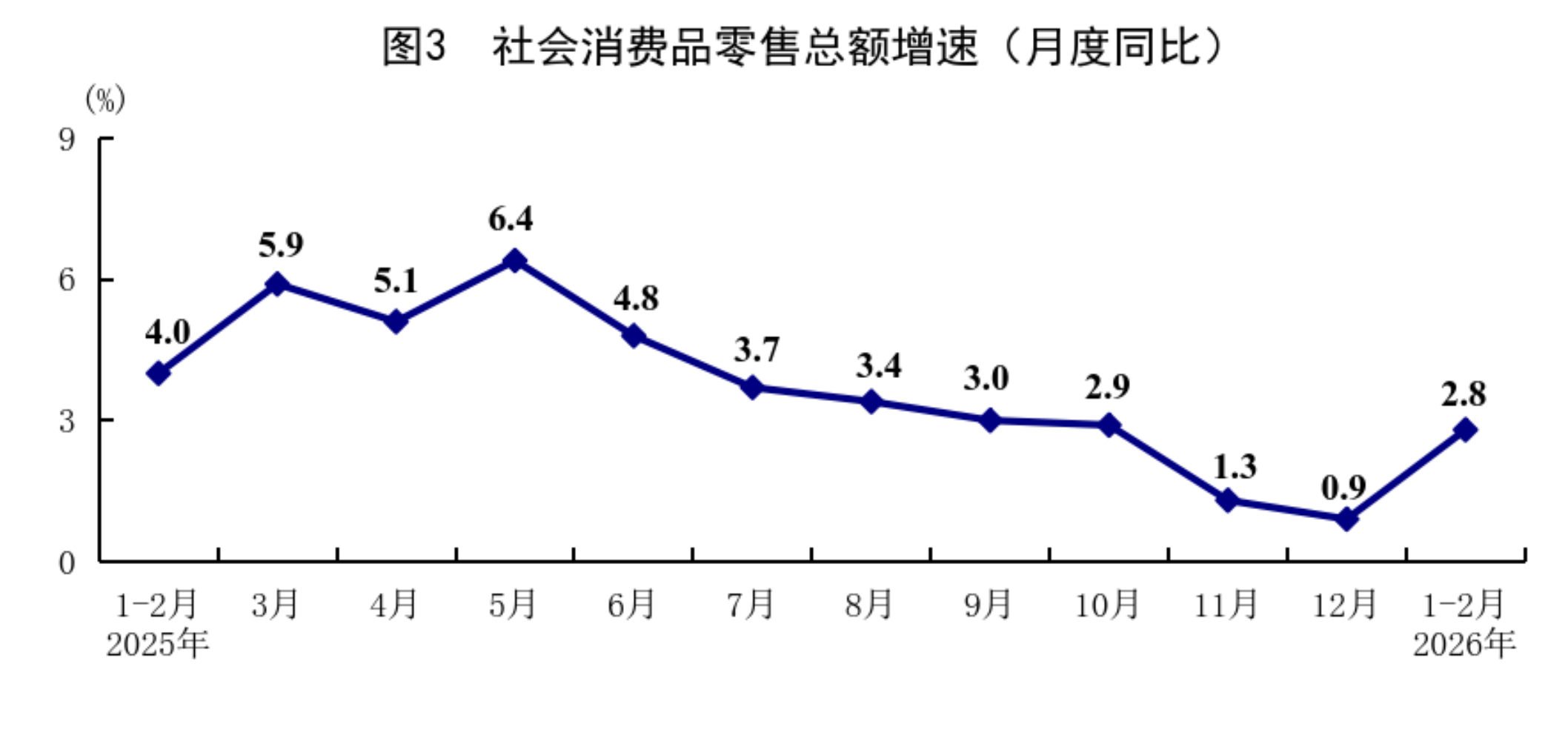 1—2月份,社會(huì)消費(fèi)品零售總額86079億元,同比增長(zhǎng)2.8%,比上年12月份加快1.9個(gè)百分點(diǎn)。按經(jīng)營(yíng)單位所在地分,城鎮(zhèn)消費(fèi)品零售額74449億元,增長(zhǎng)2.7%;鄉(xiāng)村消費(fèi)品零售額11630億元,增長(zhǎng)3.2%。按消費(fèi)類(lèi)型分,商品零售額75815億元,增長(zhǎng)2.5%;餐飲收入10264億元,增長(zhǎng)4.8%?;旧铑?lèi)和部分升級(jí)類(lèi)商品銷(xiāo)售增長(zhǎng)較快。限額以上單位服裝鞋帽針紡織品類(lèi)、糧油食品類(lèi)、通訊器材類(lèi)、金銀珠寶類(lèi)商品零售額同比分別增長(zhǎng)10.4%、10.2%、17.8%、13.0%。從環(huán)比看,2月份社會(huì)消費(fèi)品零售總額比上月增長(zhǎng)0.81%。1—2月份,服務(wù)零售額同比增長(zhǎng)5.6%,比上年全年加快0.1個(gè)百分點(diǎn)。其中,通訊信息服務(wù)類(lèi)、旅游咨詢(xún)租賃服務(wù)類(lèi)、文體休閑服務(wù)類(lèi)零售額較快增長(zhǎng)。1—2月份,全國(guó)網(wǎng)上商品和服務(wù)零售額32546億元,同比增長(zhǎng)9.2%。其中,網(wǎng)上商品零售額20812億元,增長(zhǎng)10.3%,占社會(huì)消費(fèi)品零售總額的比重為24.2%;網(wǎng)上服務(wù)零售額11734億元,增長(zhǎng)7.3%。
