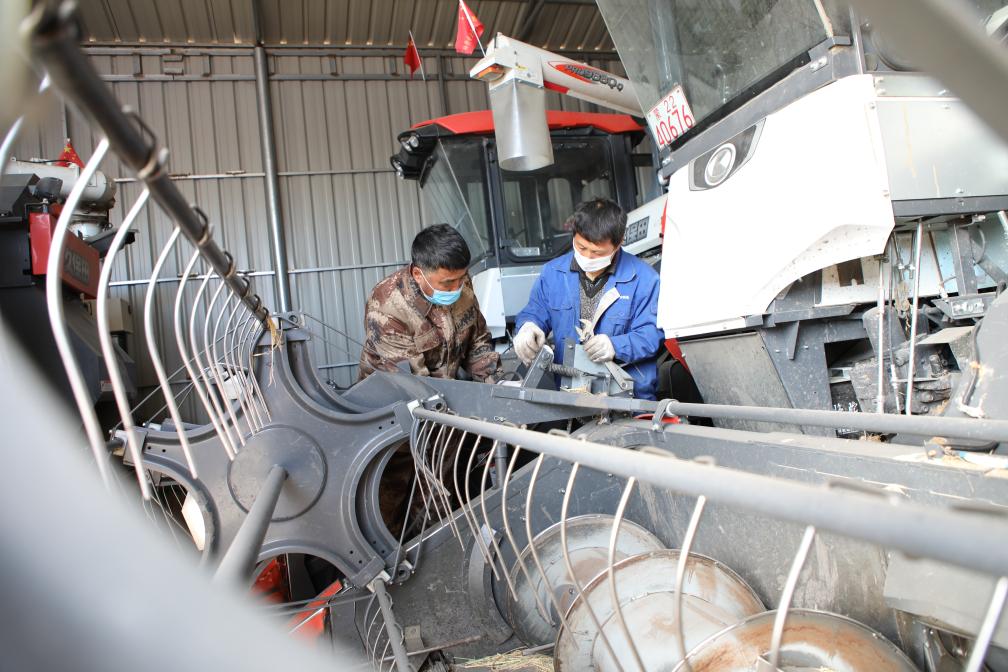 在科爾沁右翼前旗,工作人員正在檢修農(nóng)機(jī)。(時秀霞 攝)