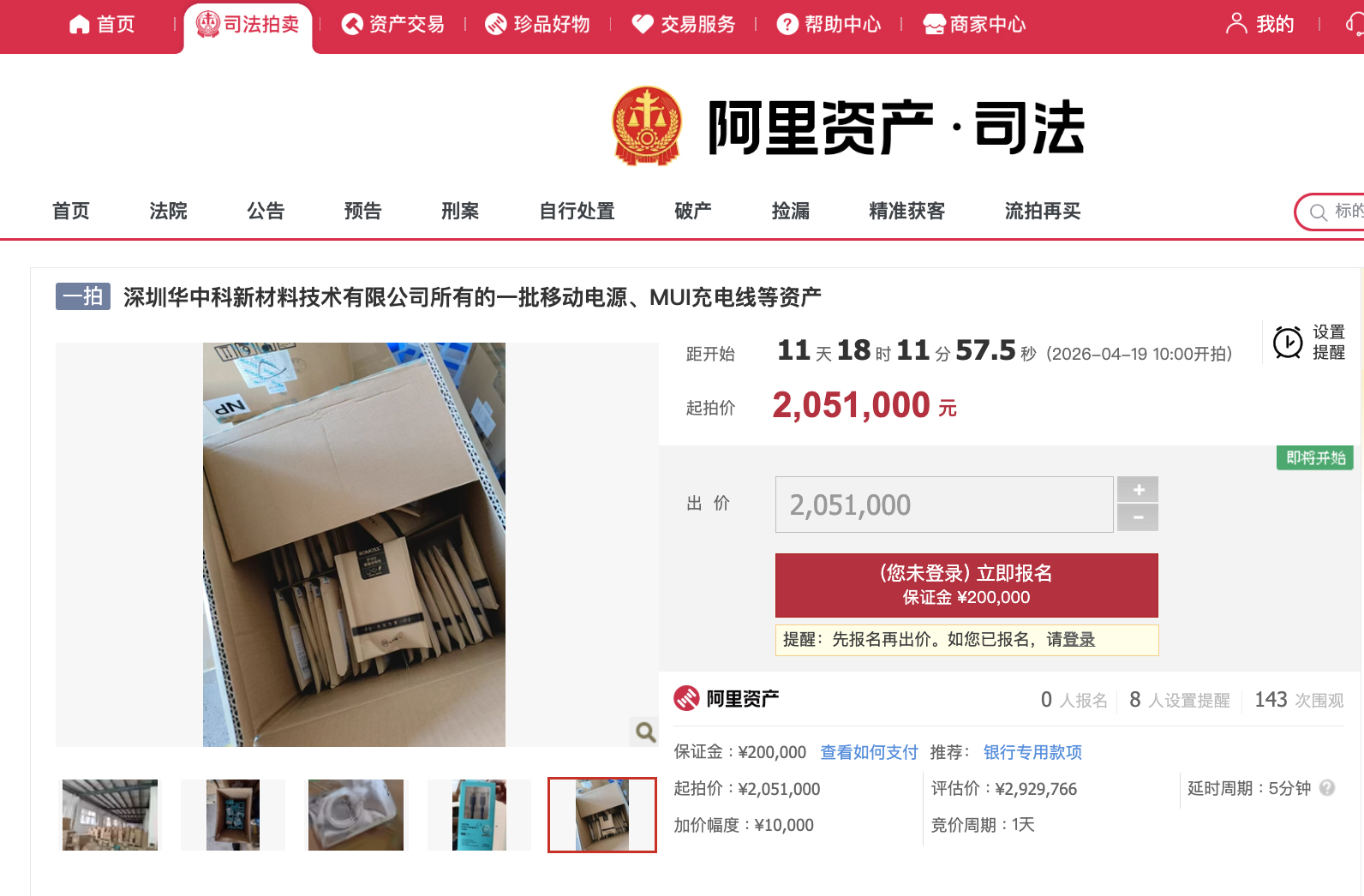 中新網(wǎng)4月7日電(吳家駒)阿里資產(chǎn)·司法平臺(tái)顯示,近日,深圳華中科新材料技術(shù)有限公司所有的一批資產(chǎn)將被司法拍賣,包括:20560只移動(dòng)電源、147478根MUI充電線等,起拍價(jià)205.1萬(wàn)元,評(píng)估價(jià)約292.98萬(wàn)元,拍賣時(shí)間為4月19日10時(shí)至4月20日10時(shí)。