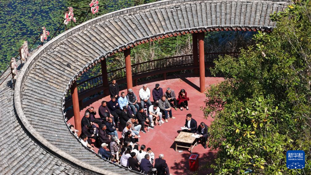 4月19日拍攝的泗洪縣上塘鎮(zhèn)墊湖村村民代表票決民生實事現(xiàn)場(無人機照片)。