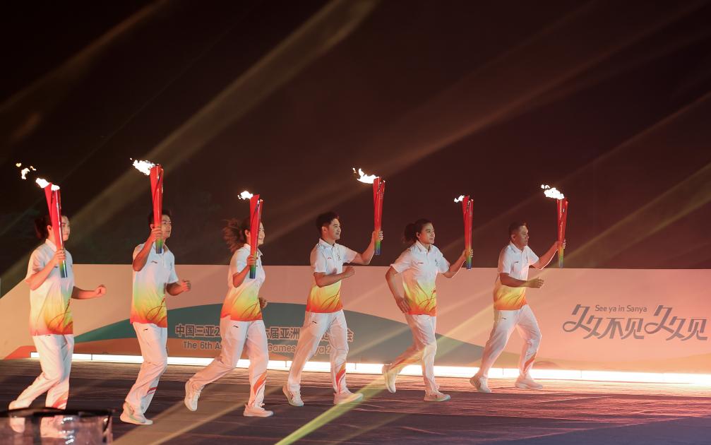 舞臺遠端,六名火炬手——乒乓球大滿貫得主丁寧、跳水奧運冠軍田亮、女籃亞運冠軍王麗麗、攀巖世錦賽冠軍龍見國、帆船運動員卓月桃和帆板教練員陳哲,高擎火炬奔跑而來。