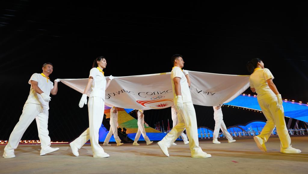 跳水奧運冠軍李娜等8人執(zhí)亞奧理事會會旗入場。亞奧理事會會歌奏響,會旗緩緩升起。