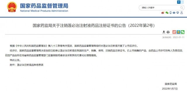 國(guó)家藥監(jiān)局:自即日起停止蓮必治注射液在我國(guó)的生產(chǎn)、銷售、使用