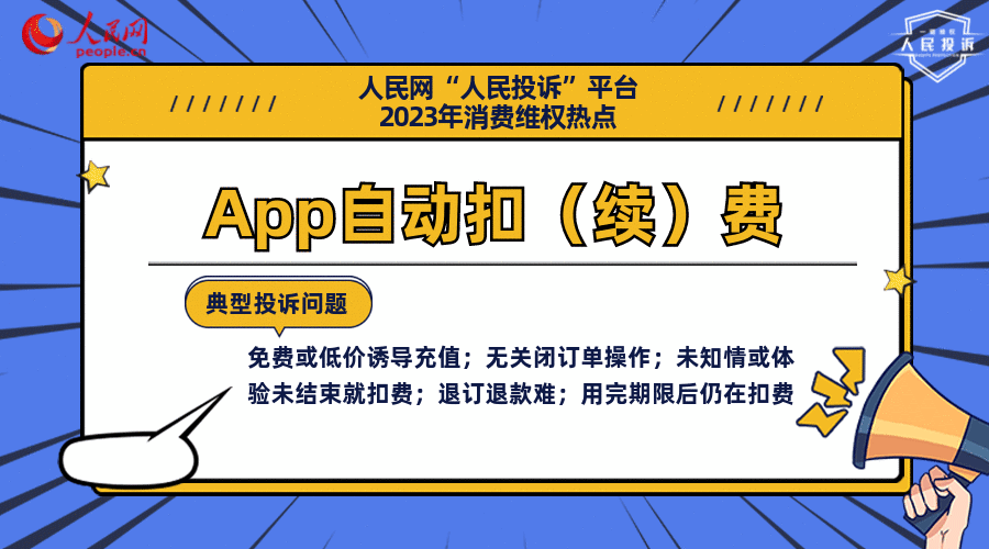 2023年以來,“人民投訴”上,被投訴的App類別涉及工具類、休閑娛樂類、閱讀學(xué)習(xí)類、通信平臺類、生活服務(wù)類、游戲類、出行服務(wù)類等多個領(lǐng)域。“未收到提示,被直接扣除一年超級會員費”“購買了一年圖片使用權(quán),無按鈕或通道取消自動扣費服務(wù)”“點擊免費試用卻被惡意扣費,平臺不退費”“7天體驗期未到,提前12小時自動扣費”“購買1年會員并充值成功,商家以充值成功為由擅自開通自動扣費季度會員”“以1元試用默認開通自動續(xù)費服務(wù),扣費達20月”“購買包月會員時,沒有別的選項可以選擇,都帶著自動續(xù)費”“免費七天VIP,在第六天就被取消了”“已經(jīng)卸載幾個月了,還在扣錢”等侵權(quán)行為令網(wǎng)友困擾不已。