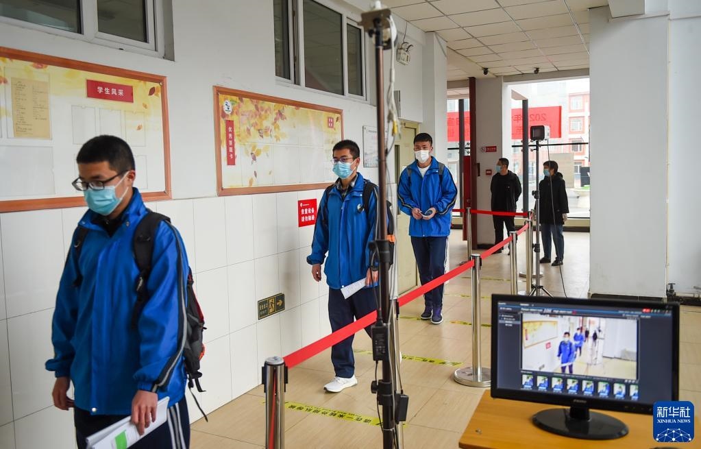 4月1日,高三年級學(xué)生走進(jìn)呼和浩特市鐵路第二中學(xué)教學(xué)樓,體溫檢測設(shè)備查驗學(xué)生體溫。