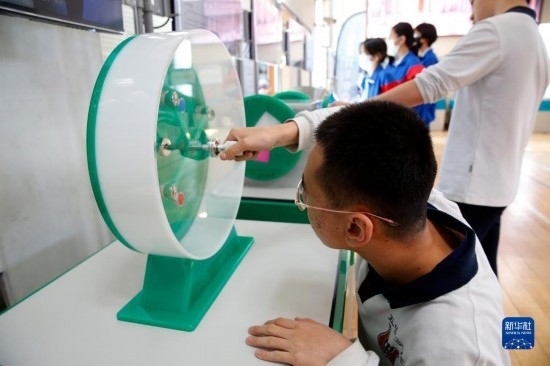 3月29日,中學(xué)生在校園流動(dòng)科普巡展中體驗(yàn)趣味科學(xué)裝置。