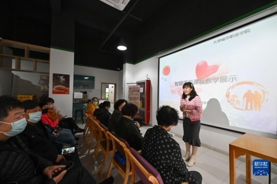 4月4日,在天津市河西區(qū)下瓦房街道居家養(yǎng)老服務(wù)中心,授課教師為老人們提供智能手機(jī)應(yīng)用教學(xué)服務(wù)。