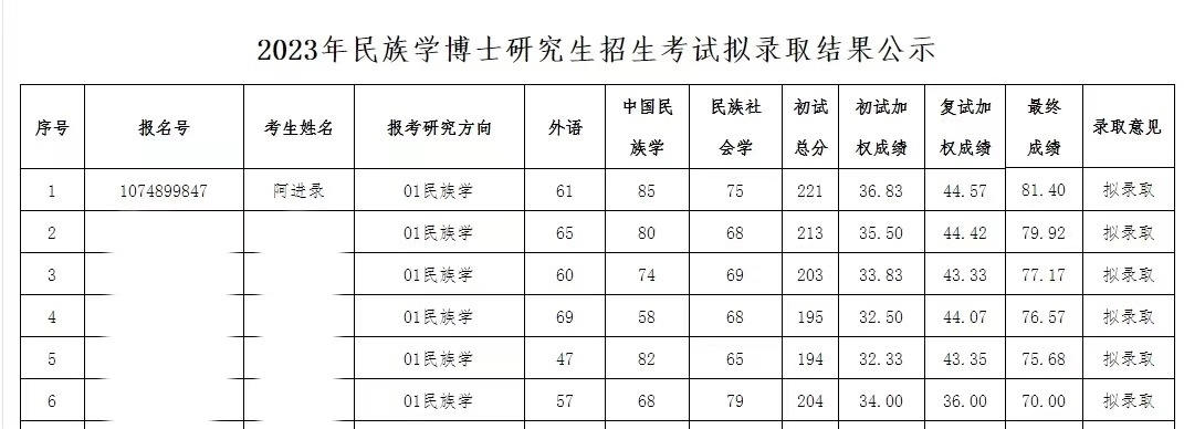 記者了解到,4月9日,青海民族大學研究生院官方網站發(fā)布《青海民族大學2023年民族學博士研究生招生考試擬錄取結果公示》。該公示稱,經2023年青海民族大學博士招生工作領導小組審議通過,擬錄取17位考生為民族學博士研究生。根據(jù)公示,考生阿進錄以最終成績81.40分進入擬錄取名單,在民族學(報考研究方向)擬錄取的6名考生中排名第一。(李依環(huán)、實習生遇鏡霖)