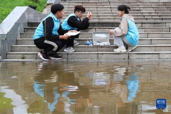 4月29日,在衡陽縣西渡鎮(zhèn)新橋村,南華大學(xué)的大學(xué)生志愿者在檢測水質(zhì)。