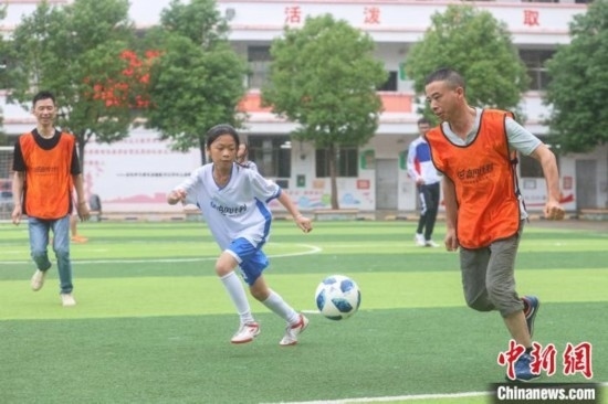 “今天第一次和爸爸踢球,我特別高興和感動(dòng)。他踢得很好,還帶球過了我?guī)状巍N蚁M职忠院竽芏嗯阄姨咔??!?4日,在江西贛州尋烏縣澄江中心校的足球場(chǎng)上,來自該校晨曦女子足球隊(duì)的隊(duì)員廖怡菱和其他四位隊(duì)員在父親節(jié)前夕,驚喜地見到了自己身在外地工作的父親,并第一次和父親一起踢球,進(jìn)行了一場(chǎng)特別的親子足球賽。