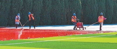 11月23日,工人在長溝中學(xué)操場進行塑膠跑道彈性層施工。 以上圖片均為宋濤攝 |