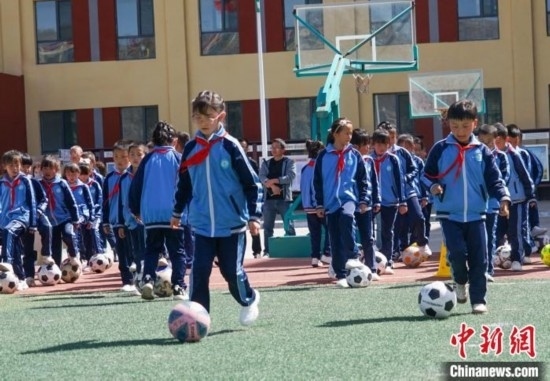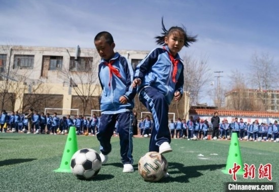 圖為在西寧市大堡子小學(xué),學(xué)生進(jìn)行足球特色大課間展示。馬銘言 攝