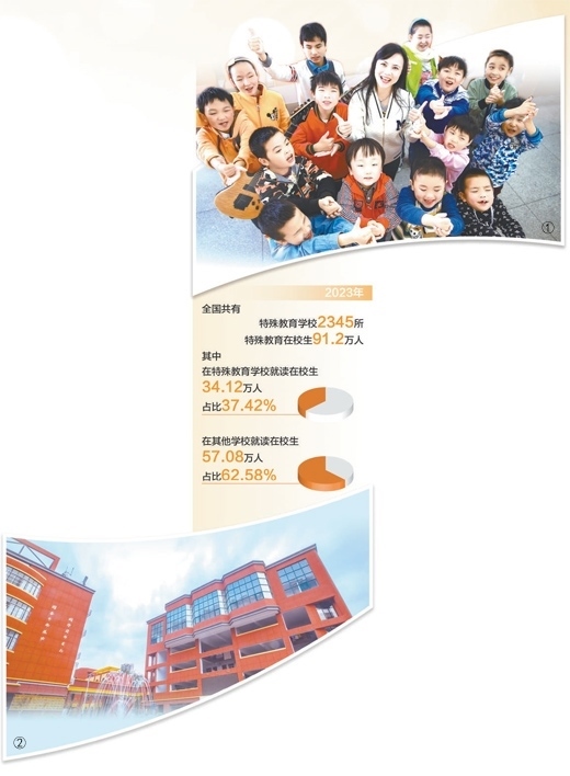 黨的十八大以來,從支持特殊教育,到辦好特殊教育,再到強化特殊教育普惠發(fā)展,我國特殊教育發(fā)展內(nèi)涵逐步深化,特殊教育普及水平和保障條件得到提升。2023年,全國共有特殊教育學(xué)校2345所,特殊教育在校生91.2萬人,其中,在特殊教育學(xué)校就讀在校生34.12萬人,占比37.42%;在其他學(xué)校就讀在校生57.08萬人,占比62.58%。