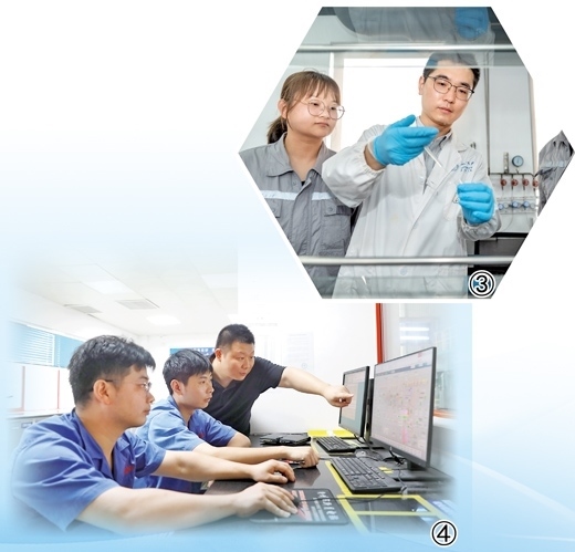 圖①:東港熱電公司博士創(chuàng)新站博士(左)與企業(yè)員工討論實驗反應結(jié)果。圖②:東港熱電公司員工(右)帶領參與博士創(chuàng)新站實踐工作的大學生檢修設備。