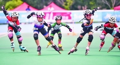 河南洛陽(yáng),小朋友們?cè)隗w育公園內(nèi)參加速度輪滑友誼賽。新華社發(fā)