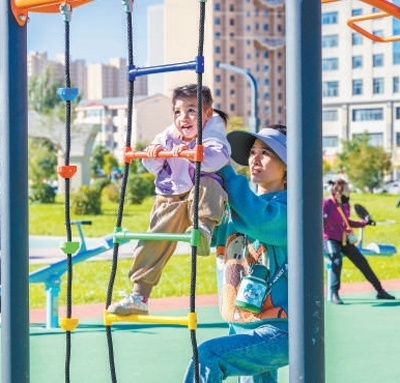 內蒙古呼和浩特萬和體育公園,家長幫助孩子攀爬軟梯。丁根厚攝(影像中國)