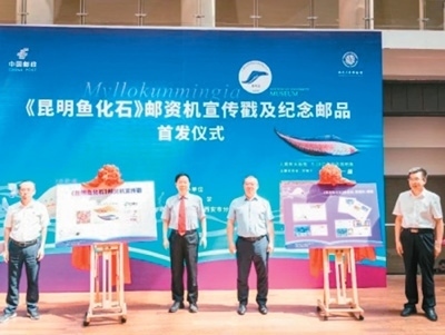 2023年5月,《昆明魚化石》郵資機(jī)宣傳戳及系列紀(jì)念郵品在西北大學(xué)博物館首發(fā)。此次啟用的《昆明魚化石》郵資機(jī)宣傳戳,是以中國科學(xué)院院士、西北大學(xué)教授舒德干團(tuán)隊(duì)發(fā)現(xiàn)的鳳姣昆明魚化石為原型設(shè)計(jì)制作。鳳姣昆明魚距今已5.18億年,是已知最古老的脊椎動物。該魚的發(fā)現(xiàn),為揭示寒武紀(jì)大爆發(fā)奧秘、破解遠(yuǎn)古生命演化謎團(tuán)提供了獨(dú)特的劃時(shí)代里程碑證據(jù)。圖為首發(fā)儀式現(xiàn)場。中新社發(fā)