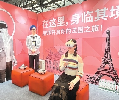 法國高校展區(qū)設立了VR體驗項目,觀眾戴上眼鏡后可以看到埃菲爾鐵塔等地標建筑。