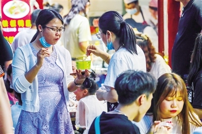 6月7日正值周日,夜幕還未降臨,大召廣場上已經聚集了不少消遣的市民,他們當中有六七十歲的老人,也有二三十歲的青年,還有牽著父母手的孩童。隨著時間的推移,廣場上的人越來越多,而緊挨著廣場的通順大巷更是人頭攢動,吆喝聲、叫賣聲、談笑聲、音樂聲混在一起,形成了夏季獨有的市井之聲。街上,從本地的稀果羹、羊肉串、烤面筋到北京爆肚、武漢臭豆腐可謂應有盡有,家家戶戶的門前都或多或少的有市民排隊等候。